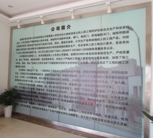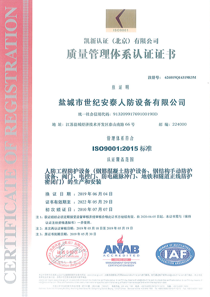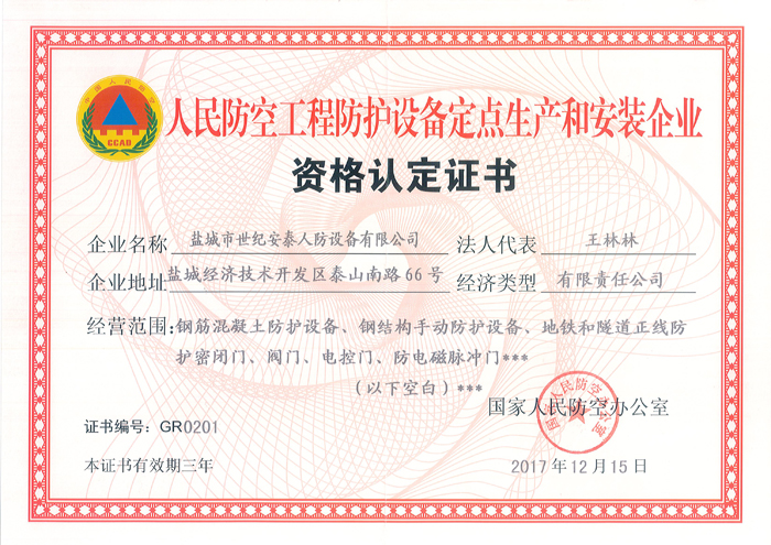 鹽城市世紀(jì)安泰人防設(shè)備有限公司是國(guó)家人民防空辦公室批準(zhǔn)成立的人防工程防護(hù)設(shè)備定點(diǎn)生產(chǎn)和安裝企業(yè),是專業(yè)生產(chǎn)、銷售、安裝人防防護(hù)設(shè)備產(chǎn)品的企業(yè),公司主要生產(chǎn)鋼筋混凝土防護(hù)設(shè)備、鋼結(jié)構(gòu)手動(dòng)防護(hù)設(shè)備、閥門(mén)、電控門(mén)、防電磁脈沖門(mén)、地鐵和隧道正線防護(hù)密閉門(mén)等各類產(chǎn)品并對(duì)產(chǎn)品進(jìn)行安裝、調(diào)試、維修及保養(yǎng),公司生產(chǎn)的各種規(guī)格的人防工程產(chǎn)品,均按國(guó)家人防總參工程兵四所及中國(guó)建筑標(biāo)準(zhǔn)設(shè)計(jì)研究院提供的圖紙生產(chǎn),符合各種人防工程設(shè)計(jì)要求,是各類地下人防工程選用的理想產(chǎn)品。本公司已通過(guò)GB/T19001-2008IDT ISO9001:2008國(guó)家質(zhì)量體系認(rèn)證。
